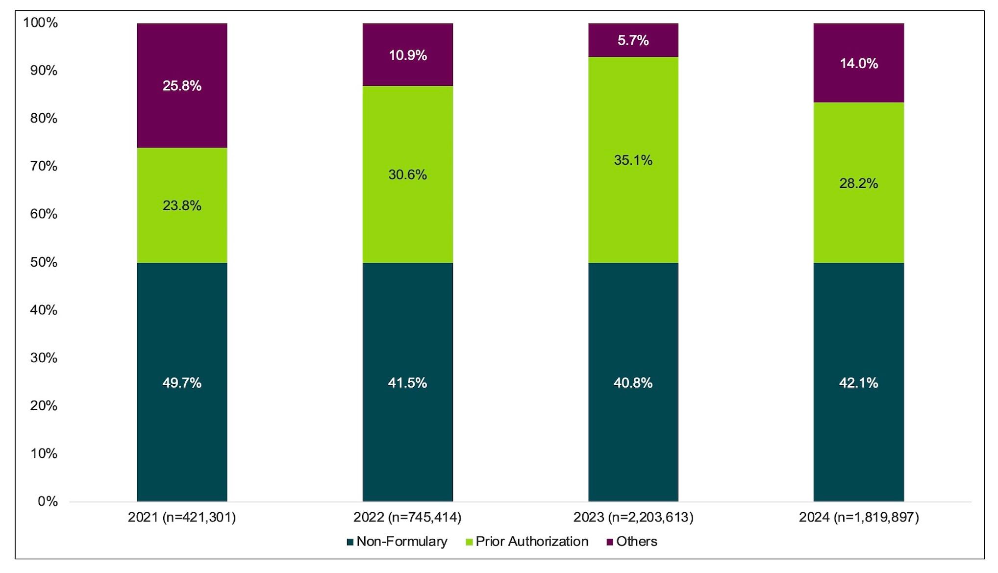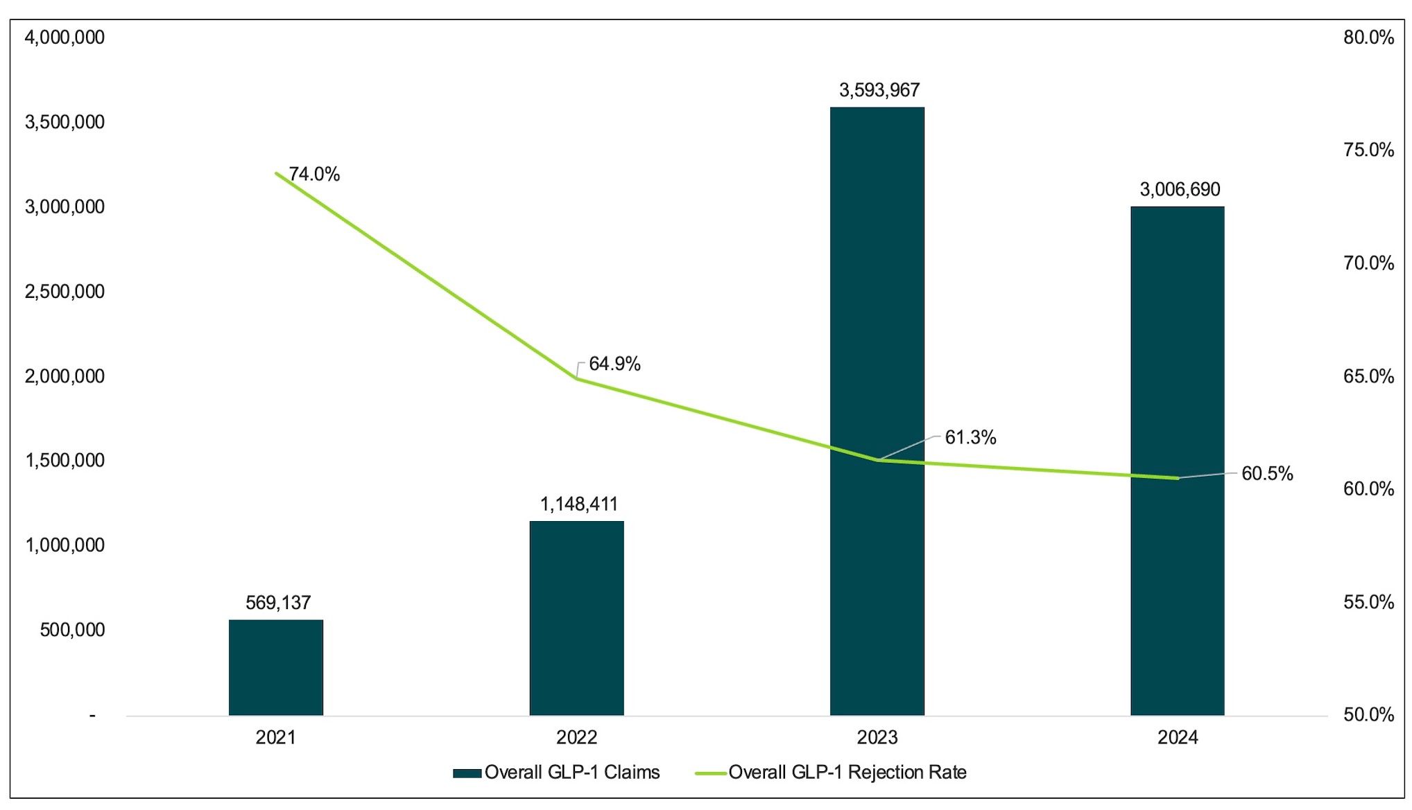 The overall rejection rate was 62.4%, with 31.1% of rejections due to PAs and 42% due to formulary exclusion. Over time, the overall rejection rate decreased: from 74% in 2021 to 60.5% by October 9, 2024 (Figure 2). This indicates that payers have increased approvals of GLP-1 claims each year, during the data period we assessed.