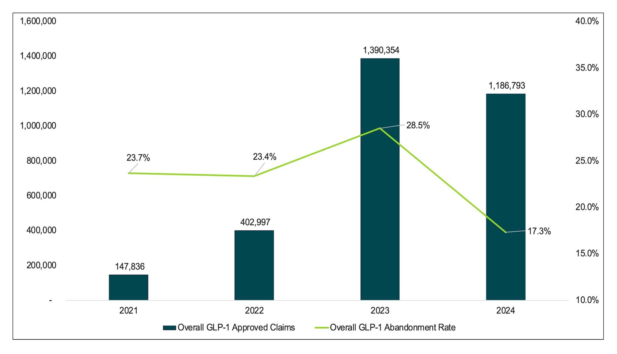 Abandonment rates for patients approved for GLP-1 use were constant for 2021 (23.7%) and 2022 (23.4%). In 2023, the abandonment rate increased to 28.5% (Figure 4). This increase may be due to an increase in the overall number of claims submitted. It is difficult to draw conclusions on the reasons why patients do not pick up their medication. Cost is 1 potential reason, but further research is needed to discern the rationale behind the abandonment rate. In 2024, the abandonment rate decreased to 17.3%; however, this was not a full data year as the period measured ended onOctober 9.