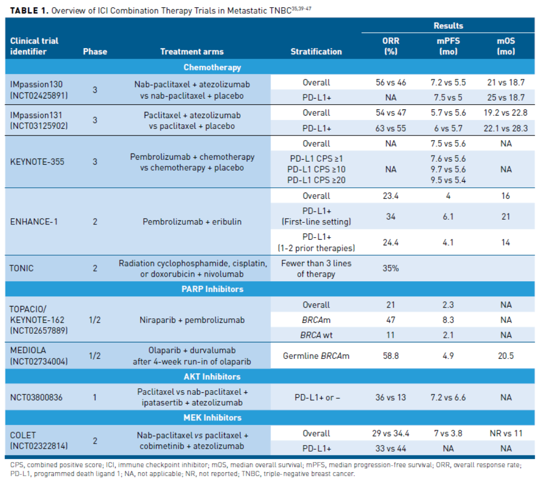 ICI-targeted therapy combinations are also emerging as potential strategies to improve response rates and potentially reduce toxicity in mTNBC, with several phase 1 and 2 trials reporting results (Table 135,39-47).