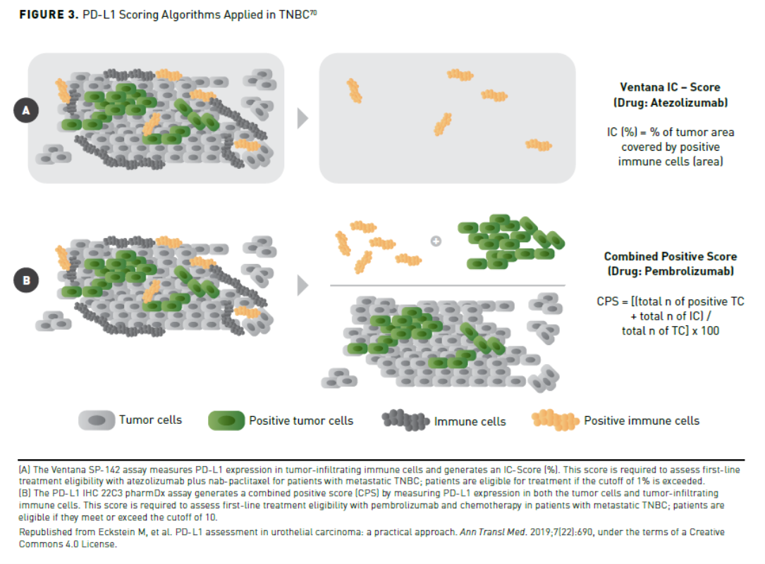 Both FDA-approved combination regimens in mTNBC are restricted to patients with PD-L1−positive tumors, and 2 antibody-based companion diagnostics for immunohistochemical analysis are available. The PD-L1 IHC 22C3 pharmDx (Dako North America) is approved for selecting patients for treatment with pembrolizumab, using a cutoff of CPS of 10 or greater. The Ventana PD-L1 (SP142) assay (Roche Diagnostics) is approved by the FDA for use with atezolizumab in mTNBC. In this case, the cutoff is an immune cell (IC) score of 1% or more. Figure 370andTable 270describe the scoring algorithms in more detail.
