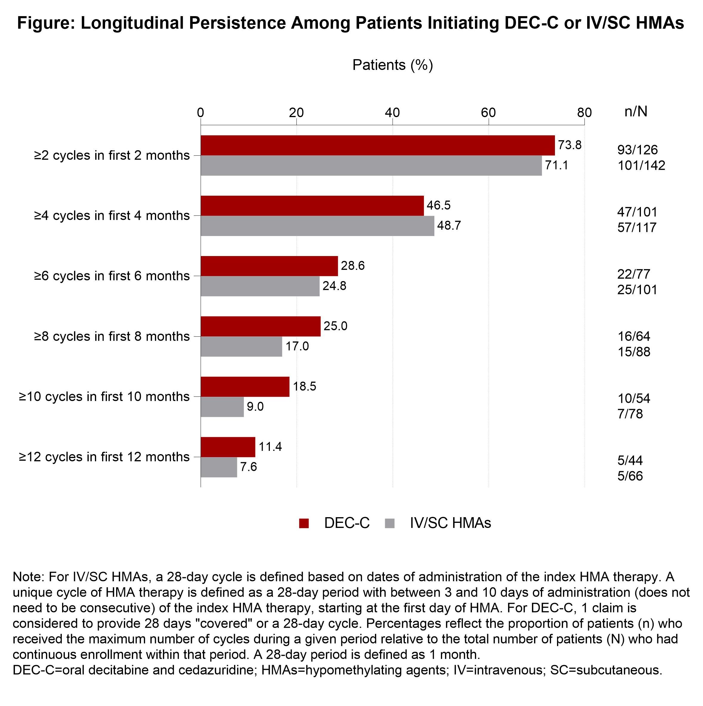 During the first 6 months after the index date, persistence was comparable between the 2 groups, with similar shares of each group receiving the maximum number of treatment cycles: at 2 months, it was 73.8% for DEC-C vs 71.1% for IV/SC; at 4 months, 46.5% vs 48.7%; and at 6 months, 28.6% vs 24.8%.