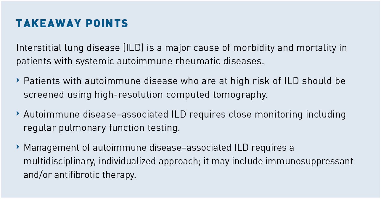 Interstitial lung disease (ILD) causes significant morbidity and mortality in patients with systemic autoimmune rheumatic diseases. Patients at high risk of ILD should be screened using high-resolution CT (HRCT), but there is no consensus as to which risk factors—or combination of risk factors—should prompt referral for HRCT. The course of autoimmune disease–associated ILD is highly variable, and it may not mirror the activity of the underlying autoimmune disease. Patients require close monitoring with periodic pulmonary function testing and symptom assessment and with repeat HRCT considered based on clinical assessment. The relevance of clinical and radiologic signs of progression—and their implications for management—ideally should be discussed by a multidisciplinary team. Management of autoimmune disease–associated ILD may involve immunosuppressant and/or antifibrotic therapy in addition to supportive care. It is important that treatment decisions be individualized to the needs and wishes of the patient. Regular follow-up is important to monitor disease progression and manage the adverse effects related to treatment.