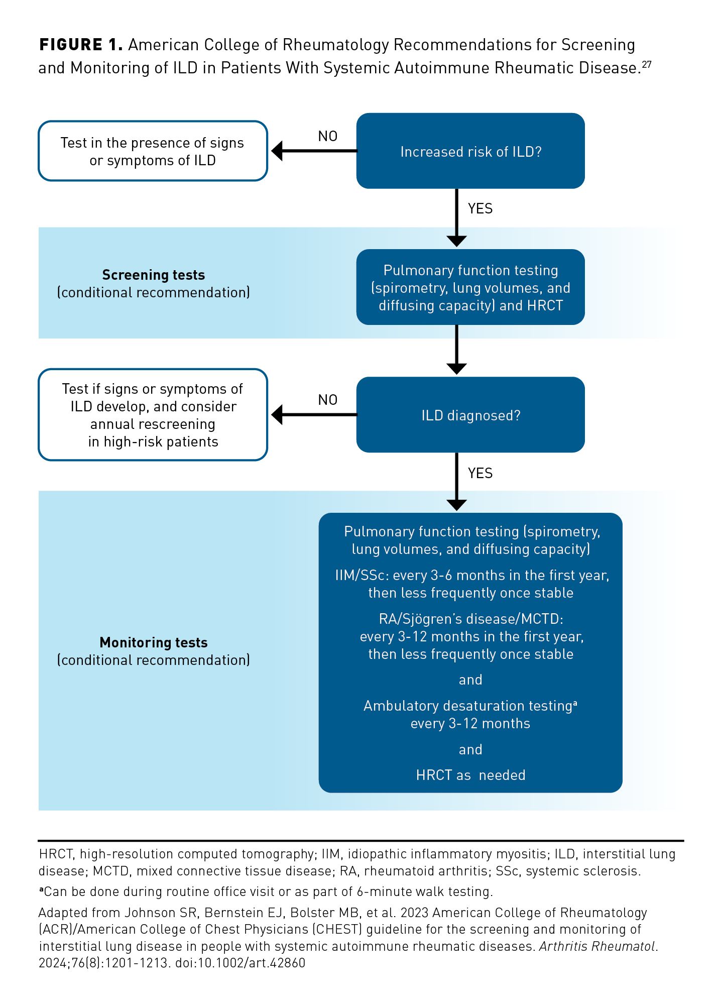 27. Johnson SR, Bernstein EJ, Bolster MB, et al. 2023 American College of Rheumatology (ACR)/American College of Chest Physicians (CHEST) guideline for the screening and monitoring of interstitial lung disease in people with systemic autoimmune rheumatic diseases. Arthritis Rheumatol. 2024;76(8):1201-1213. doi:10.1002/art.42860