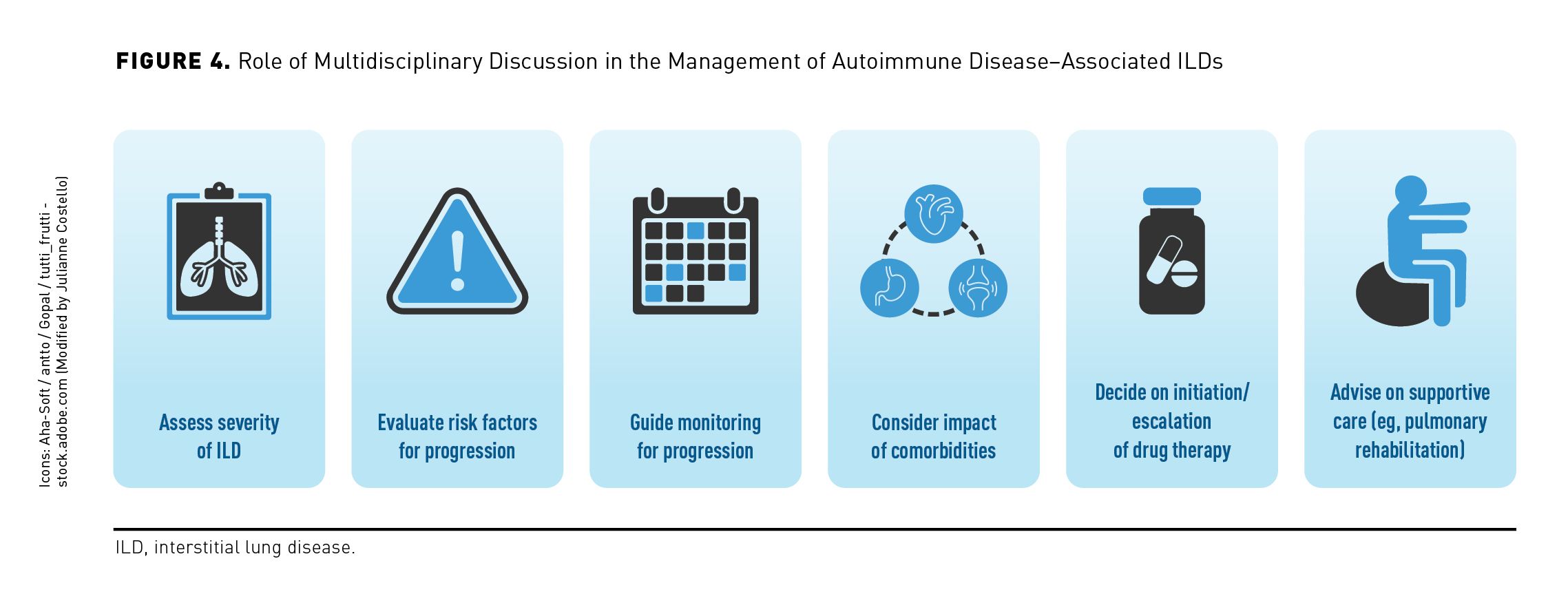 Managing autoimmune disease–associated ILDs requires a multidisciplinary approach that considers the type of autoimmune disease, the severity of the ILD and evidence of its progression, risk factors for further progression, comorbidities, and the patient’s preferences (Figure 4).59,60 Close collaboration between pulmonologists and rheumatologists is essential, whereas input from a radiologist may help identify patients at greater risk of progression.50 Specialist nurses/nurse practitioners and physical therapists can make an important contribution to the provision of patient information and supportive care.61 In deciding on a therapeutic regimen, the benefits of slowing ILD progression and potentially preventing acute exacerbations should be weighed against the risk of adverse effects (AEs).