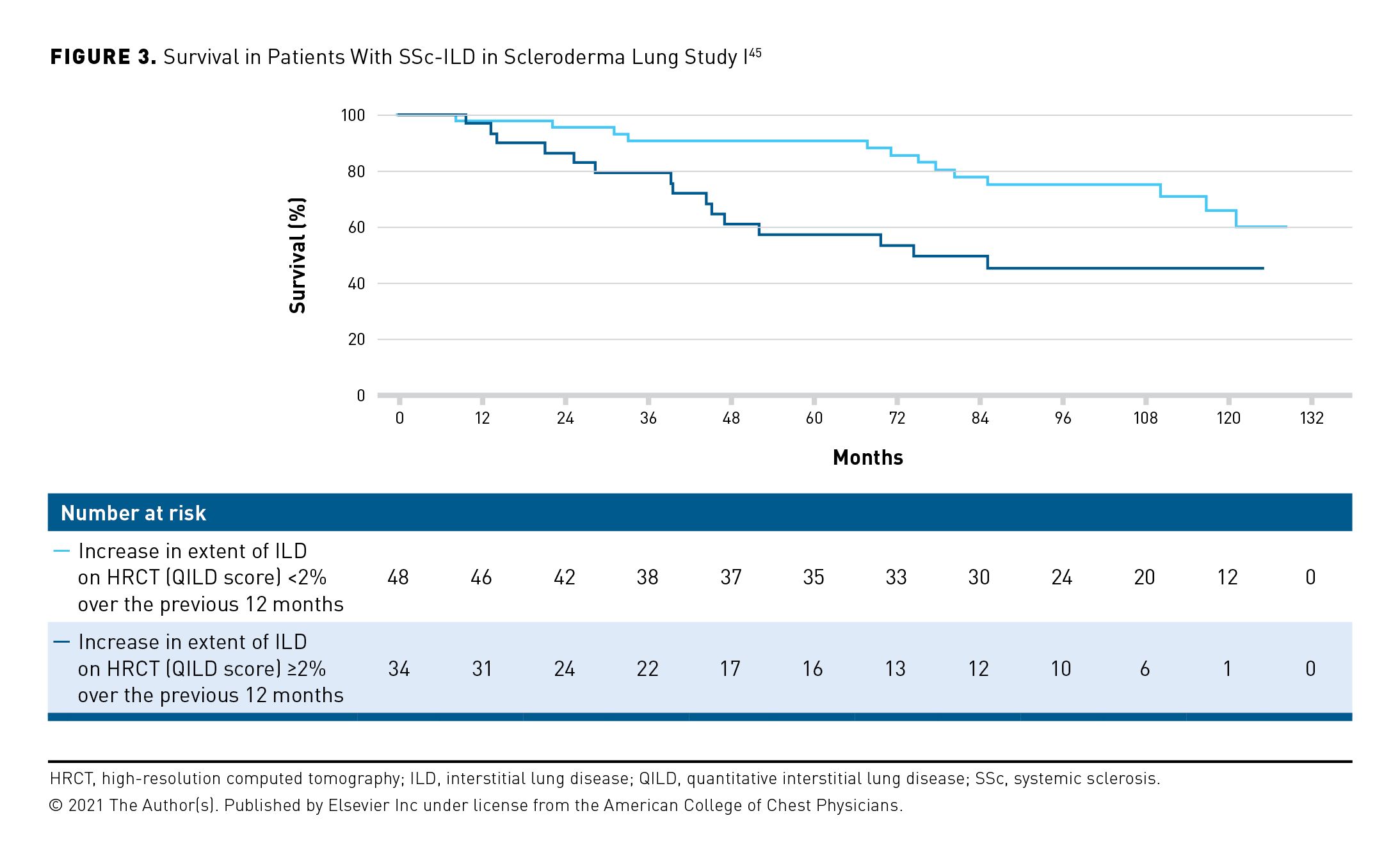 A decline in FVC or DLCO or an increase in the extent of ILD on HRCT indicates progression and is associated with an increased risk of mortality.6,9,10,44,45 In a retrospective analysis of data from 137 patients with RA-ILD followed for a median of 5 years, a decline in FVC (% predicted) of at least 10% was associated with a 2.5-fold increased risk of mortality (P <.0001).9 In a retrospective analysis of data from 162 patients with SSc-ILD followed for 15 years, a decline in FVC (mL) of 10% or more over 12 months was associated with a 1.8-fold greater risk of subsequent mortality (P = .01).10 In Scleroderma Lung Study I, patients who had an increase in the extent of ILD on HRCT (assessed using the quantitative ILD [QILD] score) of at least 2% at 12 months had a greater risk of mortality over the following 12 years than did those with smaller increases in QILD score (P = .01) (Figure 3).45