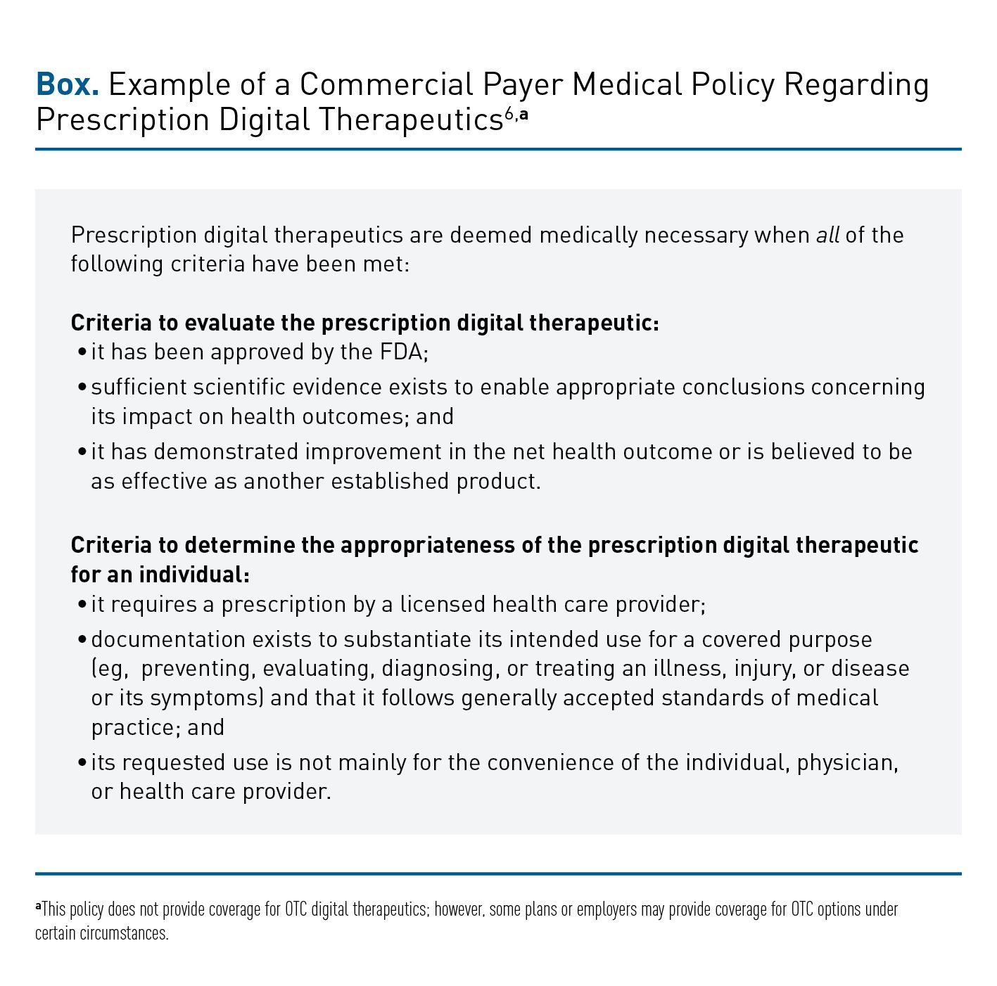 Participants discussed the value of digital therapeutics and their experiences in evaluating prescription and nonprescription digital therapeutics. The participants noted that, in their experience, commercial payers are inclined to not cover digital therapeutics that do not require a prescription or physician oversight, whereas Medicaid plans look to include some nonprescription digital therapeutics as value-added benefits. According to Christos, the value of a digital therapeutic is based on clinical evidence, and it should be supported by outcomes data. Currently, his plan does not have an overarching policy regarding digital therapeutics; however, each one is reviewed independently, and the manufacturer bears the burden of demonstrating the value of its intervention to plan decision makers. Christos discussed a video game that is a prescription treatment option for patients with ADHD; the results of a study showed that its efficacy was comparable with that of stimulant therapy. According to Christos, the efficacy results demonstrate the value of the digital therapeutic in terms of replacing a stimulant for a patient who does not want to use a controlled substance. If the digital therapeutic does not “improve any outcomes, I’m not sure there is any value,” said Christos. Evans added that value is a new concept for digital therapeutics. The classical definition of therapeutic value—that is, “the benefit minus the risk divided by the cost”—might need to be adjusted because digital therapeutics have the potential to demonstrate additional value by “providing care where otherwise it would not be provided,” Evans remarked. Desai listed a host of features to consider in the value story for digital therapeutics, such as access, scalability, efficiency, and individualization, as well as their potential to exacerbate existing health care disparities. “Not everyone has access to Wi-Fi or a smartwatch, [and these] things are not equally distributed in society,” he cautioned. “We should be very clear about the potential downsides of some of these [therapeutics].” Jiwanmall acknowledged that ensuring health equity in digital therapeutic access is an important goal; however, before that is achieved, payers need frameworks and evidence to evaluate the efficacy, safety, and quality of these products to meet clinical goals. Some payers have, or are developing, medical policies related to coverage of prescription digital therapeutics. An example of a commercial payer policy is shown in the Box.6