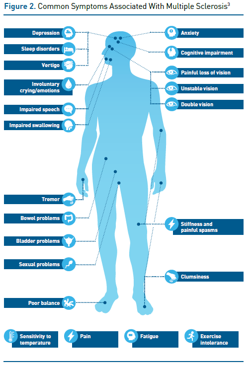 In relapsing-remitting MS, symptoms that appear in the form of relapse (also known as an attack or bout) may include sensory symptoms (eg, numbness, tingling, or burning pain), motor symptoms (eg, weakness, stiffness, clumsiness, difficulty walking, impairments in speech and swallowing), visual disturbances, physical or mental fatigue that interferes with daily activities, mood disorders (eg, depression and anxiety), genitourinary and bowel dysfunction, tremor, and stiffness, among others (Figure 2).3