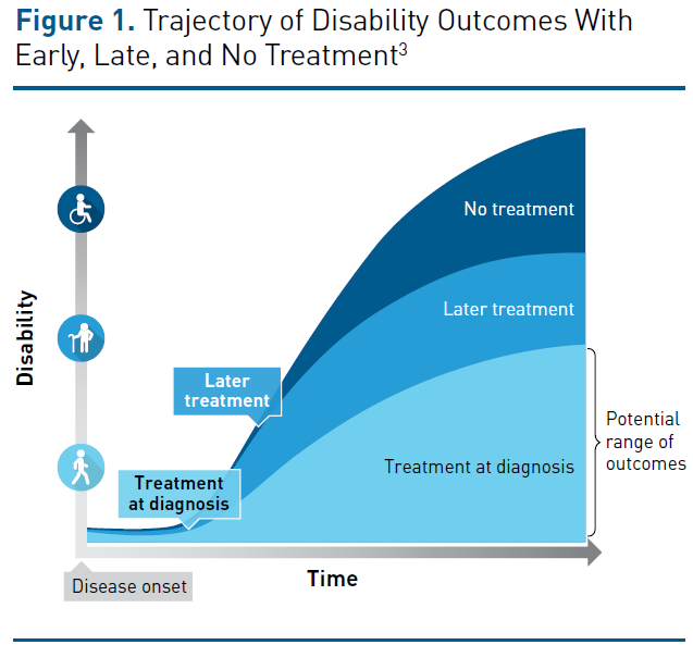Early, aggressive, and ongoing treatment with DMTs is important to reduce clinical and subclinical attacks and delay the onset of the progressive phase of disease, thereby helping to prevent onset of disability, prolong activity and engagement, and maintain quality of life.1 A 2018 report of the Guideline Development, Dissemination, and Implementation Subcommittee of the American Academy of Neurology (AAN) recommended offering DMTs to patients with relapsing forms of MS who have had recent relapses and/or MRI activity, including those with 1 clinical episode who fulfill the 2010 International Criteria for MS, because of the demonstrated benefits with reducing relapses and MRI activity.14 Additionally, DMTs are associated with a delay in a second clinical relapse or new MRI-detected brain lesions in patients with a single demyelinating event and 2 or more MRI-detected brain or spinal cord lesions.14