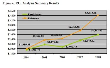 The slide below—the key outcomes display of the Eastman Chemical/Health Fitness Corporation’s Koop Award-winning program application—clearly shows increasing savings over the period of the 2 “baseline years” (2004 and 2005 on the slide below) before the “treatment years” (2006 to 2008) got underway. Phantom savings reached almost $400/year/employee by 24 months (2006), even though the program was not available to would-be participants until the 24th month.