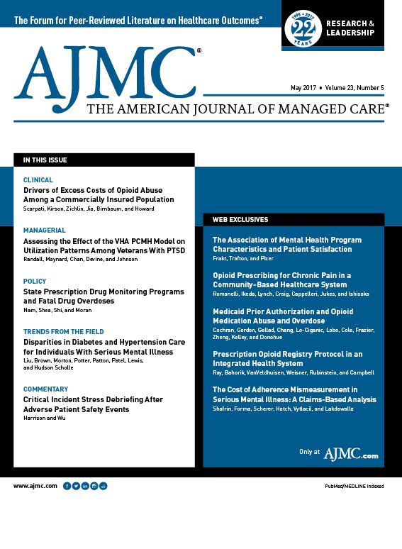 Opioid abuse is also costly; societal costs of opioid abuse in 2007 were estimated at $55.7 billion.2 Payers face a large proportion of these costs; previous estimates of the annual per-patient economic burden to payers of opioid abuse range from $10,000 to $20,000.3-5 Despite growing concern, the current literature has only begun to address the drivers of these excess costs of opioid abuse in terms of place of service and comorbid conditions.