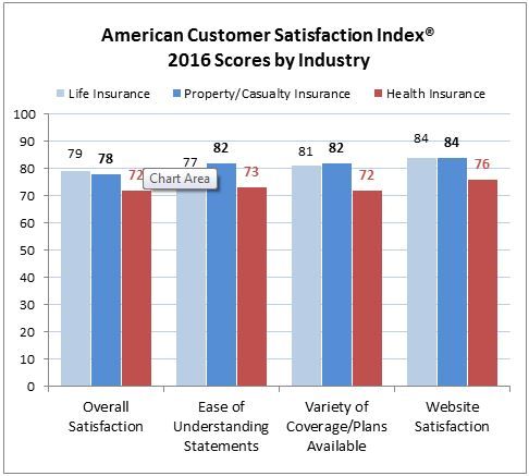 The health insurance industry as a whole performs relatively poorly on customer satisfaction ratings, and is consistently ranked in the bottom quartile of all industries studied by the American Consumer Satisfaction Index (ACSI). While customer satisfaction on the provider side of healthcare has been (unfavorably) compared to that of the fast food industry,2 the experiences of health insurance customers are more appropriately compared to those of other types of insurance. As shown in the chart below, consumers are significantly less satisfied with their health insurance than with property and life insurance.