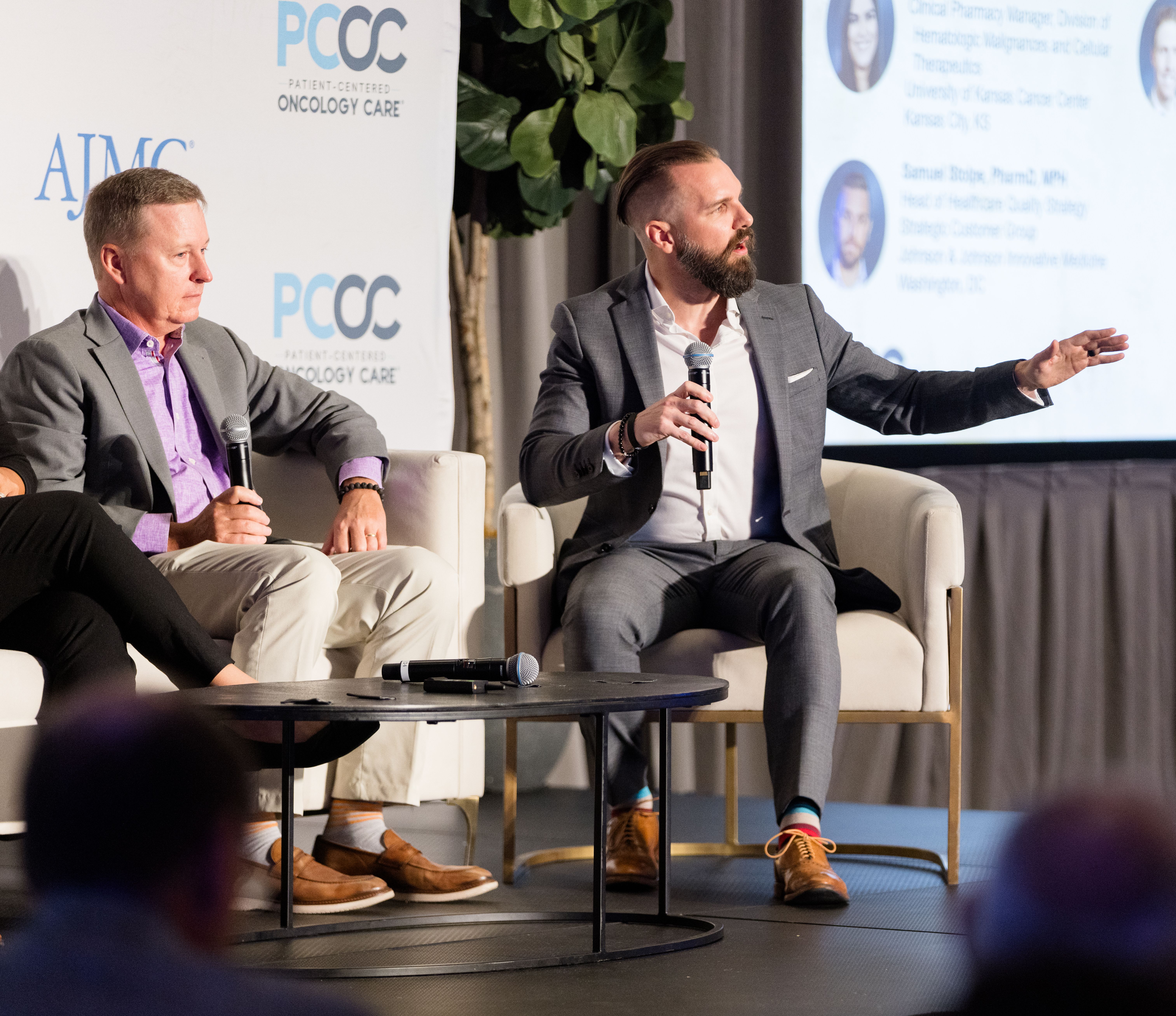 Samuel Stolpe, PharmD, MPH, of Johnson & Johnson Innovative Medicine, at right, makes a point while Bruce Wilson of AstraZeneca looks on. | Image credit: Greg Smit for AJMC