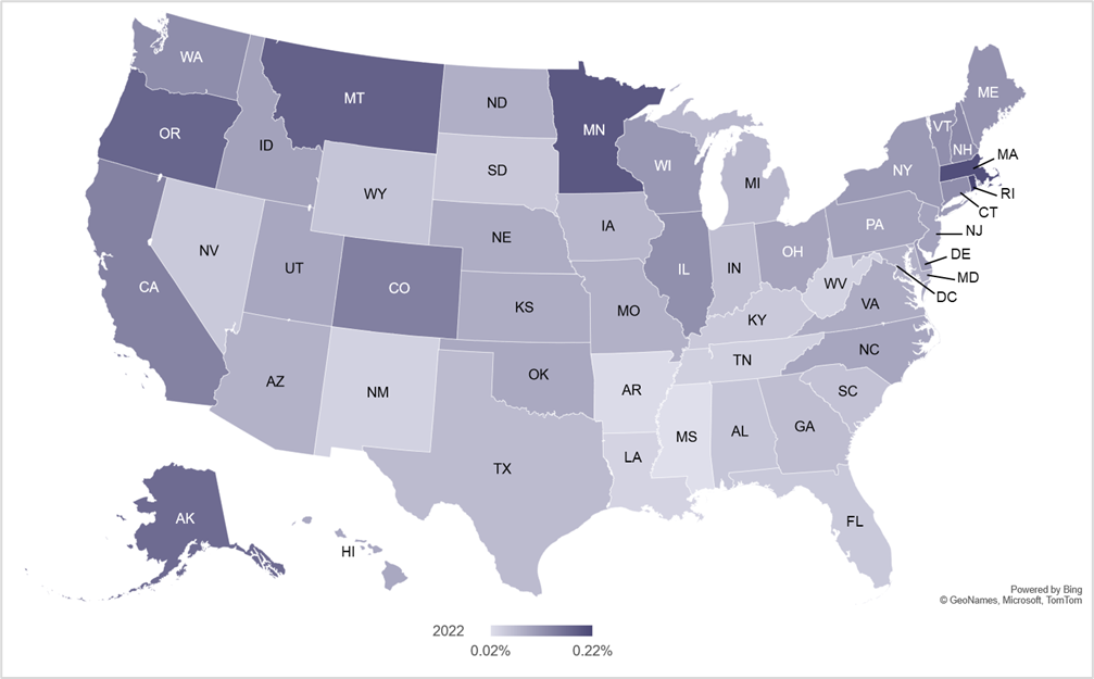 Figure 2. Eating Disorder Claim Lines as a Percentage of Medical Claim Lines by State, 2022