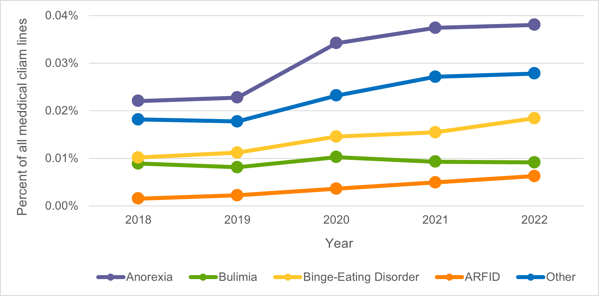 Figure 1. Claim Lines for Specific Eating Disorders as a Percentage of All Medical Claim Lines, 2018-2022
