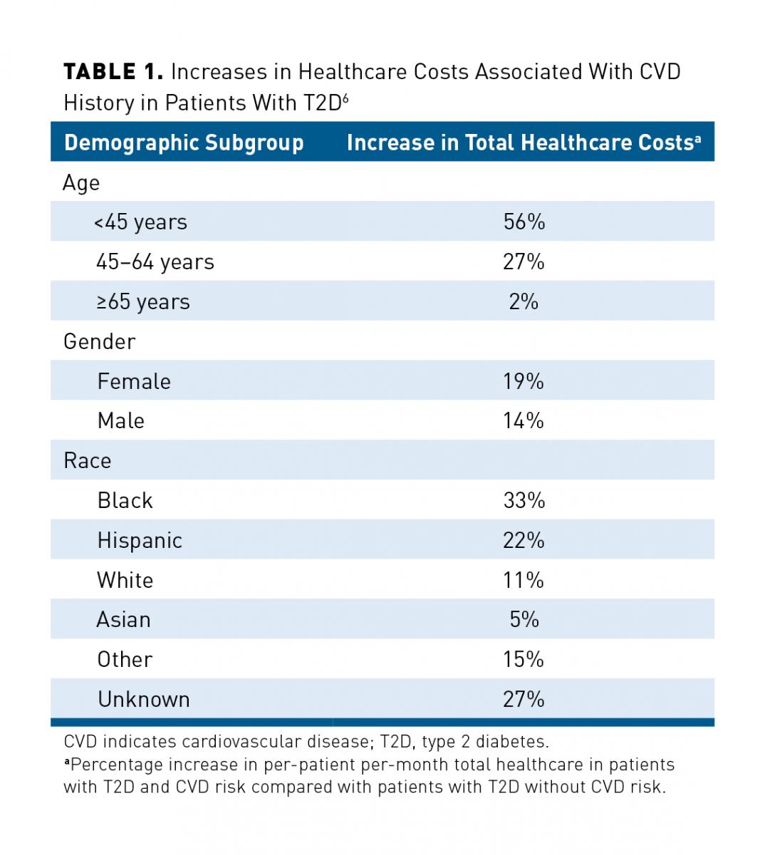 Individuals with diabetes have costs that are over 2 times higher than for those without diabetes.1 These incremental costs are associated with comorbidities and diabetes complications, with the costs of comorbidities accounting for a large portion of direct medical costs of diabetes.2,4 A closer look reveals that cardiovascular disease (CVD) is a major driver of the direct medical costs of diabetes comorbidities, and these direct medical costs manifest in multiple ways. Diabetes also contributes to 16% of the total deaths due to CVD, which, in addition to the personal loss, results in $7.6 billion in lost productivity.1