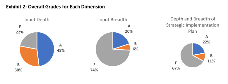 Exhibit 2 shows the grades for each dimension. More than 1 in 5 hospitals received a failing grade for input depth, three-fourths received a failing grade for input breadth, and two-thirds received a failing grade on implementation plans for addressing patient needs. Some hospitals performed very well, however: nearly half of all hospitals received an A for input depth and roughly 1 in 5 hospitals received an A for input breadth of implementation plans.