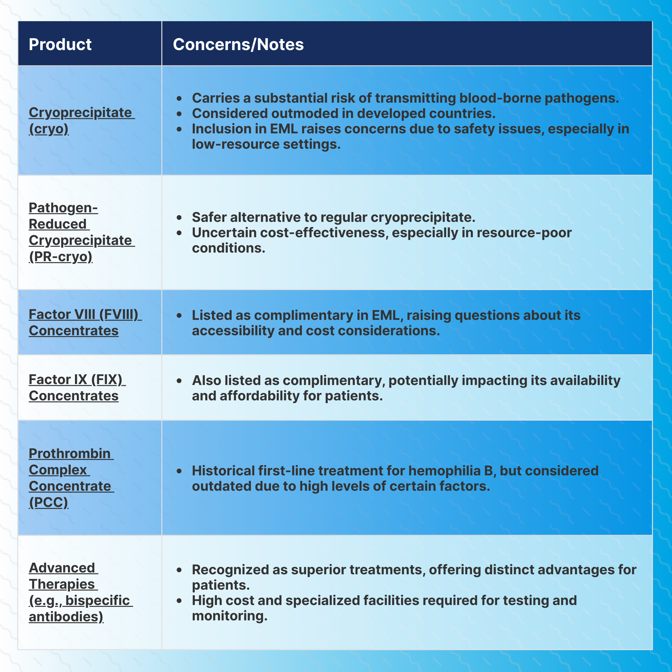 Patients with hemophilia B, in particular, could experience disadvantages if a core-listed medicine is not specified, calling for careful reconsideration of these classifications to ensure equitable access to essential treatments.