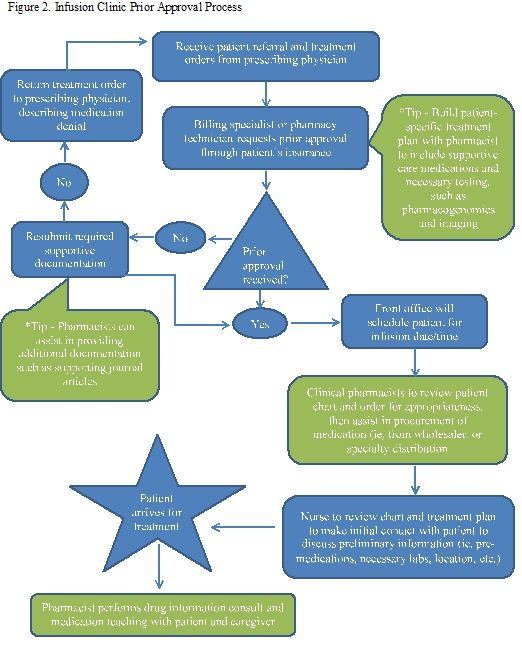 In contrast to the inpatient diagnosis-related group codes for the purposes of hospital payment, the primary mechanism in ambulatory settings for authorization of drug regimens is the approval by a patient’s insurance company. Multiple services can be used to ensure accurate payment for drugs and to improve the overall fiscal responsibility of an infusion clinic ().