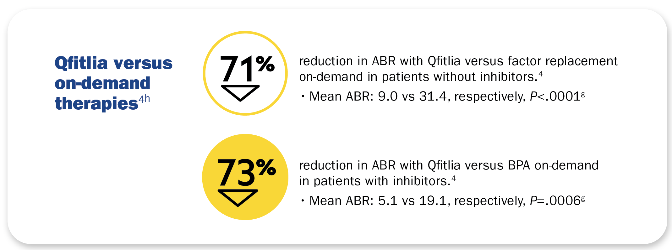 Treatment with Qfitlia under the AT-DR resulted in significant bleed reduction when compared with on-demand therapies, including a 71% reduction in estimated annualized bleeding rate (ABR) compared with on-demand treatment with clotting factor concentrates in patients without inhibitors (CFCs; mean ABR: 9.0 vs 31.4, respectively, P<.0001). It also showed a 73% reduction in estimated ABR when compared with on-demand treatment with bypassing agents in patients with inhibitors (BPAs; mean ABR: 5.1 vs 19.1, respectively, P=.0006; Figure 1).4,g