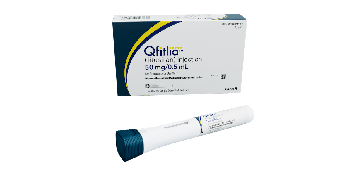 Qfitlia™ (fitusiran) is an antithrombin (AT)-directed small interfering ribonucleic acid (siRNA) indicated for routine prophylaxis to prevent or reduce the frequency of bleeding episodes in adult and pediatric patients aged 12 years and older with hemophilia A or B with or without Factor VIII or IX inhibitors.