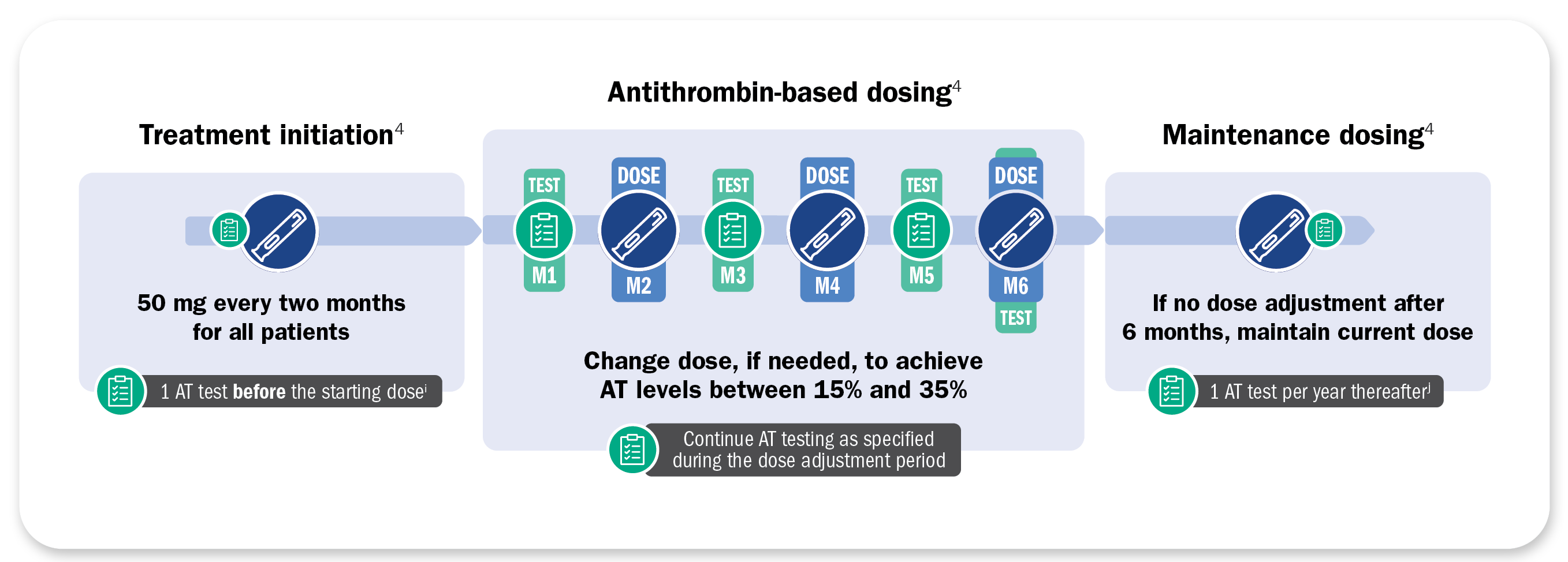 Qfitlia dosing is guided by AT levels, which can be easily and reliably measured in plasma to personalize treatment. Under the AT-DR study (n=227), approximately 67% of people with hemophilia took Qfitlia every other month and 19% took it monthly (Figure 3).4