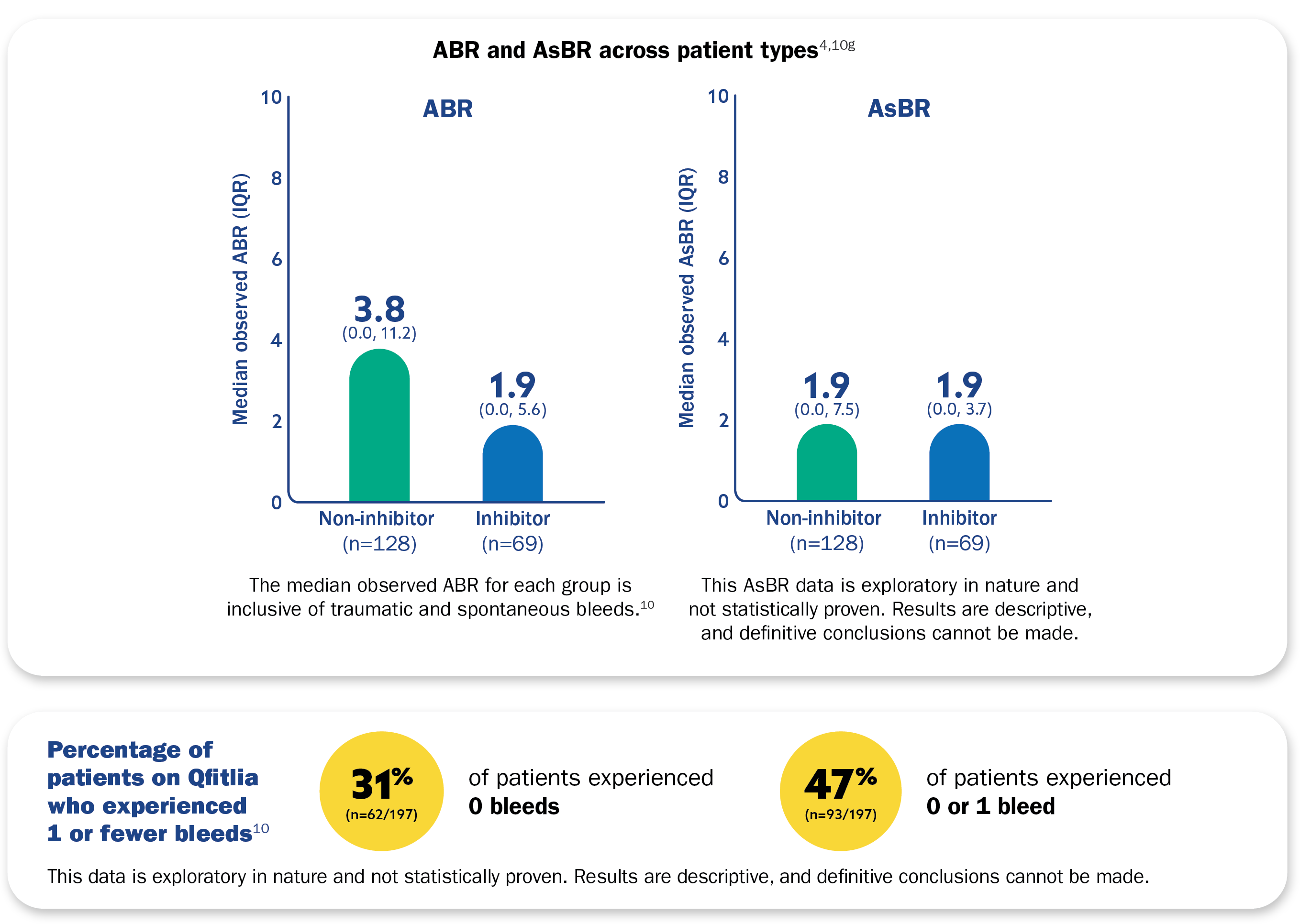 ABRs of Qfitlia following prior BPA or CFC prophylaxis were reduced or comparable, respectively (estimated mean ABR for BPA: 3.41 vs 11.29; estimated mean ABR for CFC: 6.93 vs 5.96).10 These data are exploratory in nature and are not statistically proven. Results are descriptive, and definitive conclusions cannot be made.