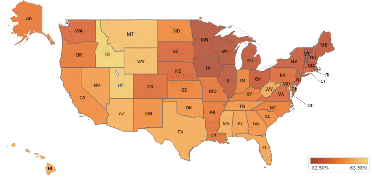 FIGURE 2. Percent Change in Utilization of Dental Services from March 2019 to March 2020, by State