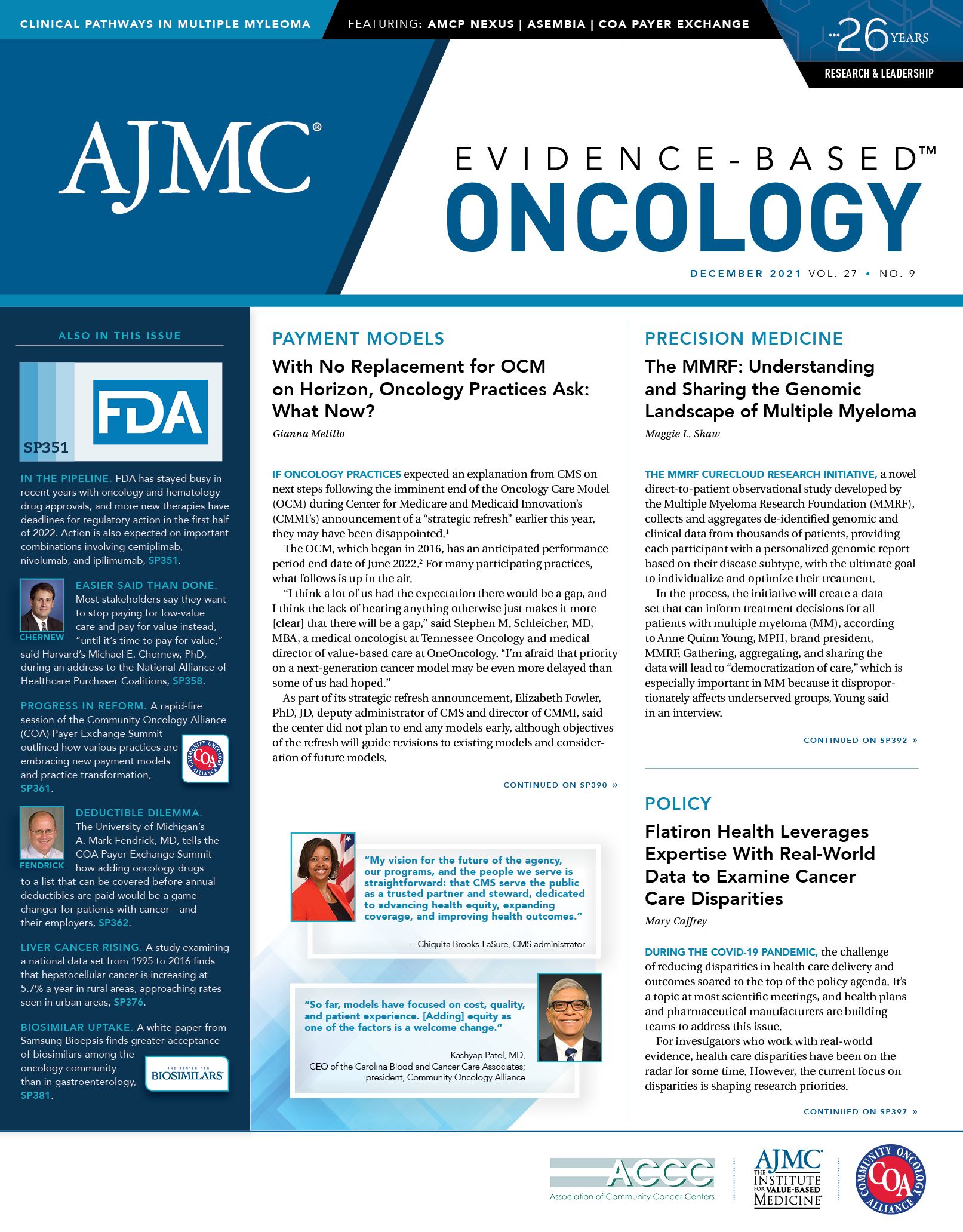 EBO: So, your conclusion is that the use of clinical data during routine care can allow for real-time evaluation of health care policy. Since your study appeared, we’ve had CMS announce a “refresh” of the work on payment models undertaken by the Center for Medicare and Medicaid Innovation (CMMI).4 If you’ve had time to review the CMMI proposal, what can we expect? Can we anticipate that the use of real-world evidence on disparities will be used by CMMI? To create the successor to the Oncology Care Model (OCM)?