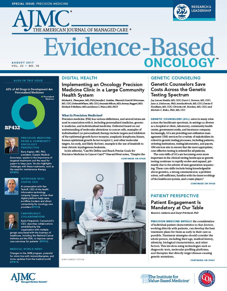 At the Regions Hospital/HealthPartners care system in Minnesota and western Wisconsin, laboratory GCs reviewed 904 genetic test send-out orders from June 2015 to May 2016, resulting in an overall 13.5% test modification/cancellation rate and a total of $263,000 in cost savings for all genetic test order requests (including orders that were not oncology-related testing) (Table). For the subset of oncology-related test orders tracked by one of the GCs (n = 80 cases), a total of just over $150,000 in cost savings was realized (Table). Approximately 9% of test orders were modified after review by, and consultation with, the GC. The laboratory GC provided consultation to the ordering provider in 45 of the 80 cases (56%), facilitated insurance PA in 33 of the 80 cases (41%), and referred 8 patients (10%) to a clinical genetics specialist.