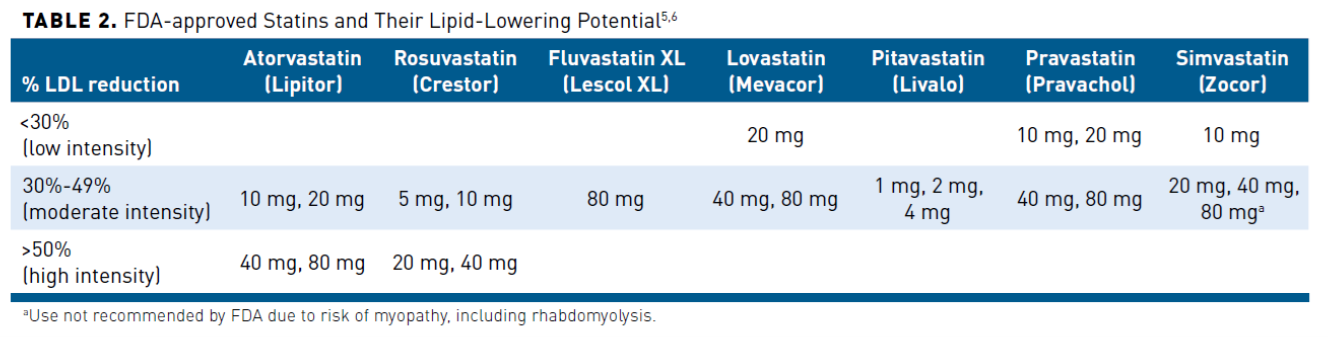 The revised guideline continues to recommend statin therapy strongly for patients with an increased risk of ASCVD and emphasizes evaluating the magnitude of each patient’s response while on statin therapy.5 Based on significant evidence supporting the benefits of reducing LDL-C to reduce ASCVD, the guideline recommends using the maximally tolerated statin dose (see Table 25,6). For this reason, the guideline accentuates personalized assessment of risk for patients to determine risk of heart disease. Discussion of risk-enhancing factors (eg, family history of premature ASCVD, ethnicity, metabolic syndrome, chronic kidney disease, chronic inflammatory conditions, and premature menopause or preeclampsia) is deemed prudent.5