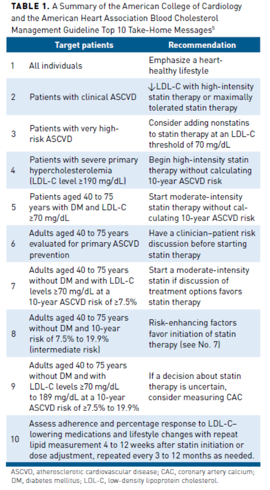 In November 2018, the American College of Cardiology and the American Heart Association (ACC/AHA) updated their hyperlipidemia guideline.5 This update provides a summary with the “Top 10 Take-Home Messages” to employ in the lipid management of patients (see Table 1).5