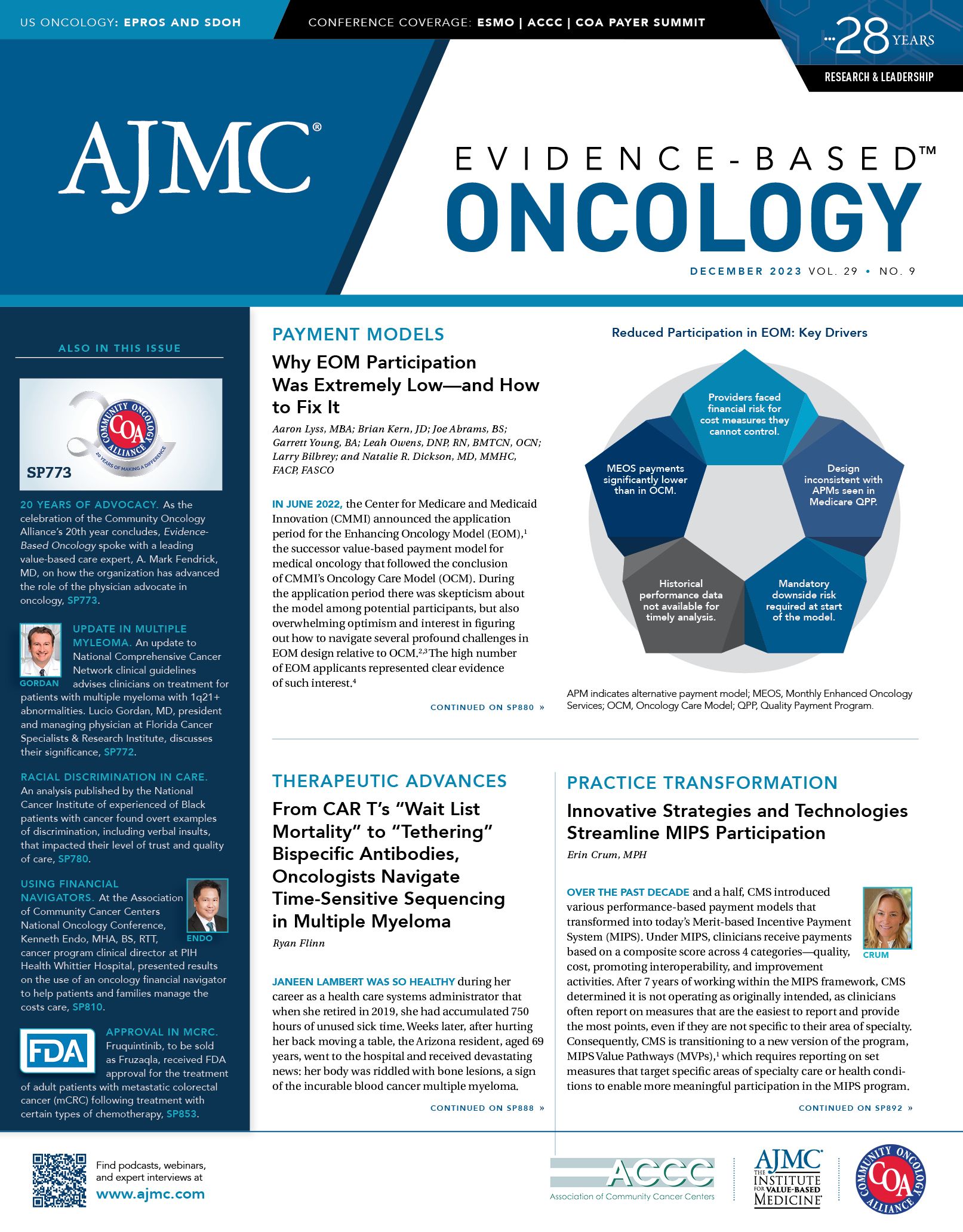 In the context of Medicare Advantage (MA), which provides coverage for those 65 years and older, the program’s popularity is growing due to plans that provide nontraditional benefits, such as vision, dental, or gym memberships, compared with original Medicare. In 2023, for the first time ever, more than half of all Medicare beneficiaries are covered by MA, and this number is projected to rise to 70% to 80% in the next 7 to 10 years.5 MA is inherently a risk-based model, motivating primary care physician (PCP) groups to accept risks and proactively manage patient care to reduce costly emergency department visits and provide better care. Additionally, primary care groups are increasingly taking on risks to align incentives and deliver higher-value care, and health plans are focusing on managing utilization and increasing the advanced services offered, along with seeking high-quality partners to provide better patient care. Finally, the presentation highlighted a significant shift toward value-based care in oncology, where various groups are engaging to deliver high-quality, high-value cancer care, moving away from traditional fee-for-service (FFS) models. This transformation underscores the need to manage patients’ cancer more effectively in the evolving health care landscape.