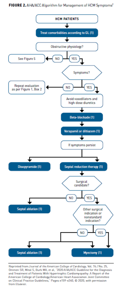 The 2020 American Heart Association/American College of Cardiology (AHA/ACC) Guideline for the Diagnosis and Treatment of Patients with Hypertrophic Cardiomyopathy largely categorizes management decisions based on whether a patient’s HCM is obstructive or nonobstructive and whether AF, ventricular arrhythmias, and HF are present.2 To this end, treatment must be individualized and requires a thorough understanding of the natural history of HCM. It is also important to remember that currently available pharmacologic therapy does not alter the natural history of HCM; instead, the primary goals involve relief of symptoms (eg, exertional dyspnea, palpitations, angina) and improvement in quality of life (QOL).13