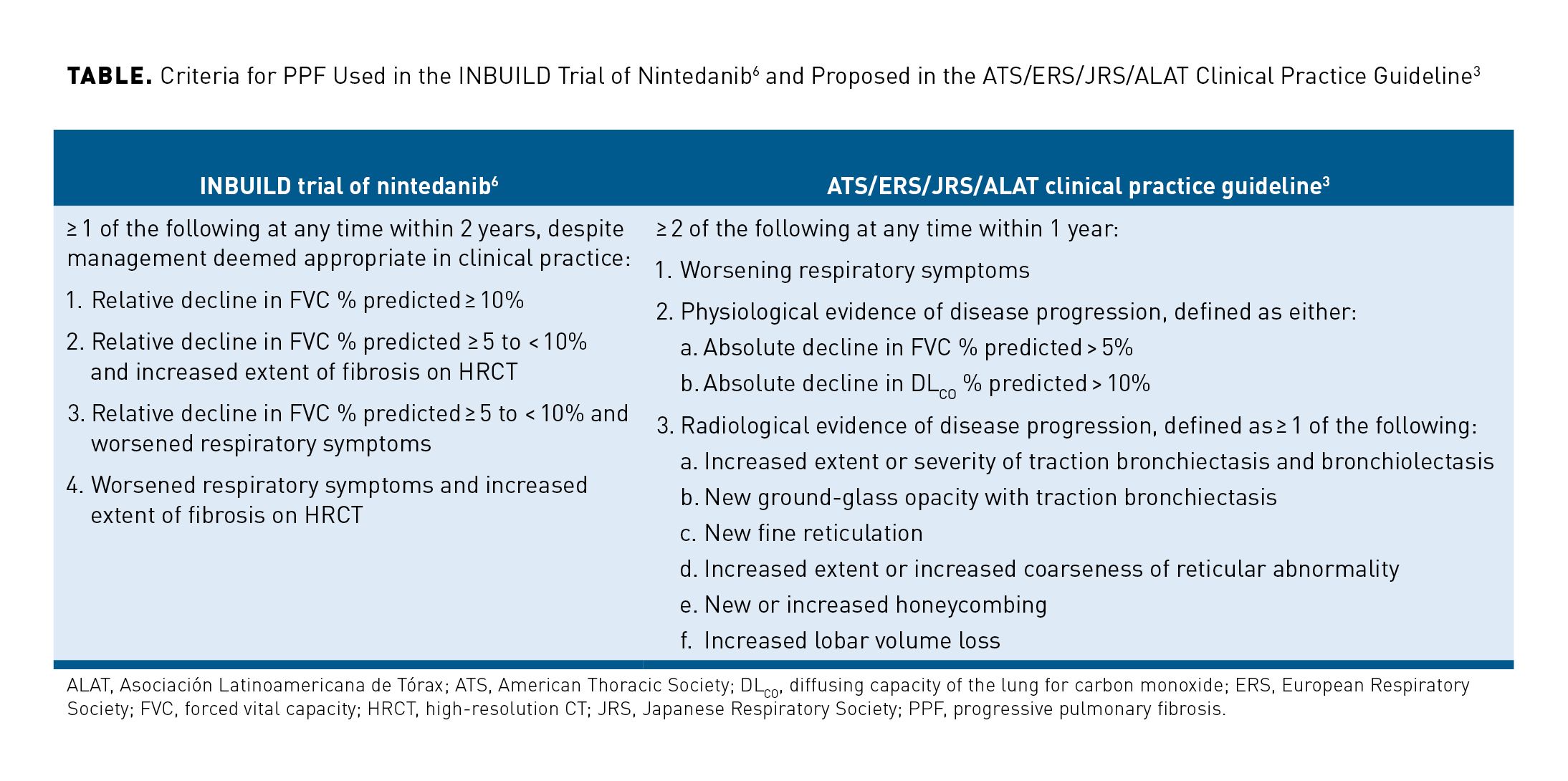 Several sets of criteria have been proposed for the identification of PPF, mainly based on expert consensus and extrapolation from what is known about disease behavior and prognosis in IPF.3,6-10 The most widely used criteria are those developed to identify patients with PPF for enrollment in the INBUILD trial of nintedanib6 and those later proposed in a clinical practice guideline published by the American Thoracic Society, European Respiratory Society, Japanese Respiratory Society, and Asociacion Latinoamericana de Torax (ATS/ERS/JRS/ALAT) in May 2022 (Table).3,6 Most definitions of PPF include some combination of a decline in forced vital capacity (FVC) and/or diffusing capacity for carbon monoxide (DLCO), a worsening of respiratory symptoms, and an increase in the extent of fibrosis on high-resolution CT (HRCT). However, there is variability in terms of the magnitude of change in these parameters that should define progression and the time period over which progression should be assessed. The ATS/ERS/JRS/ALAT guideline stated that the criteria for identification of PPF may be fulfilled at any time within a 1-year period,3 while other criteria use a 2-year window.6,7,9,10 It is important to note that progression may occur at any time within the specified time period and needs not be assessed over its whole duration. Further, some experts have argued that no time frame should be applied when assessing progression in clinical practice, as progression is predictive of a poor prognosis regardless of the time period over which it occurs.11