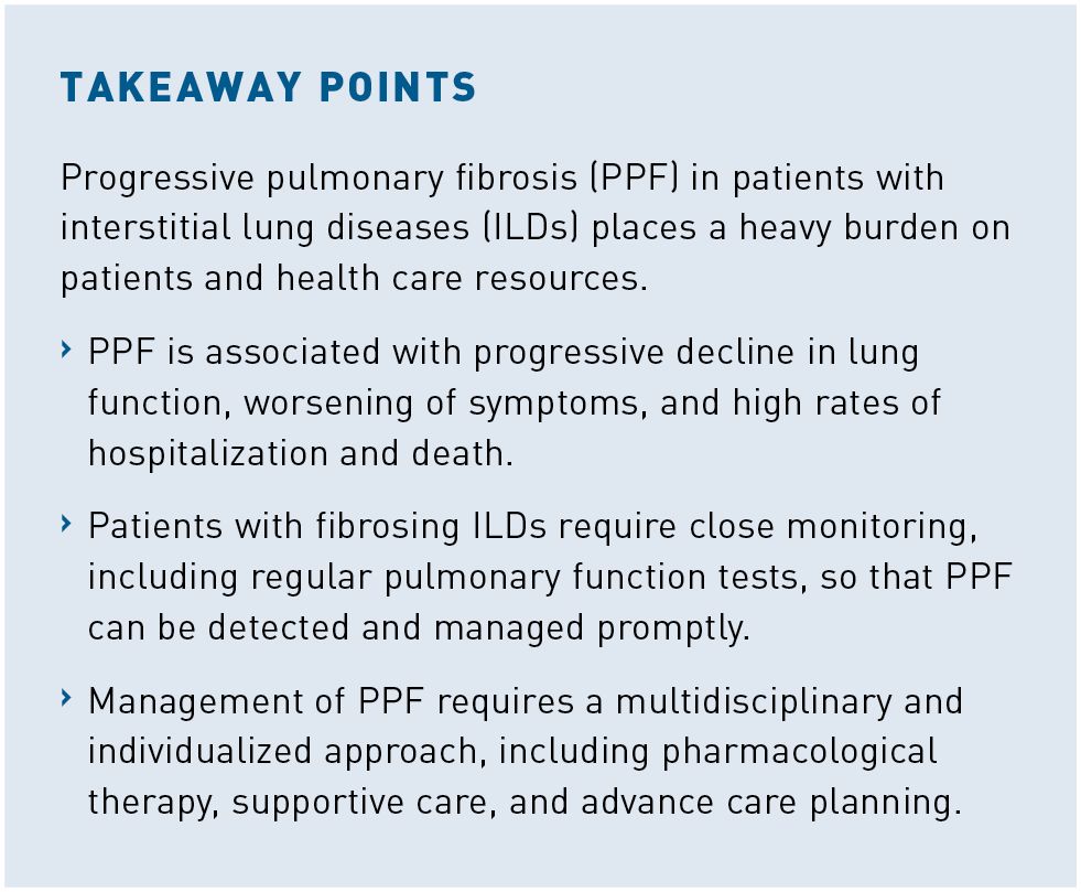 Interstitial lung diseases (ILDs) comprise a large group of disorders characterized by inflammation and/or fibrosis of the lung parenchyma. Some ILDs have a known cause, for example, ILDs related to autoimmune diseases1 or occupational exposures,2 while others are idiopathic, the most common of which is idiopathic pulmonary fibrosis (IPF).3 Environmental factors, such as exposures to dusts, molds, or chemicals,4 and genetic variants5 contribute to the development of ILD. A proportion of patients with ILDs develops pulmonary fibrosis that becomes progressive. The term “progressive pulmonary fibrosis” (PPF) or “progressive fibrosing ILD” (PF-ILD) is generally used to describe progressive lung fibrosis in an individual with an ILD other than IPF (which is, by definition, a progressive disease).3 This article describes the identification, course, and management of PPF.