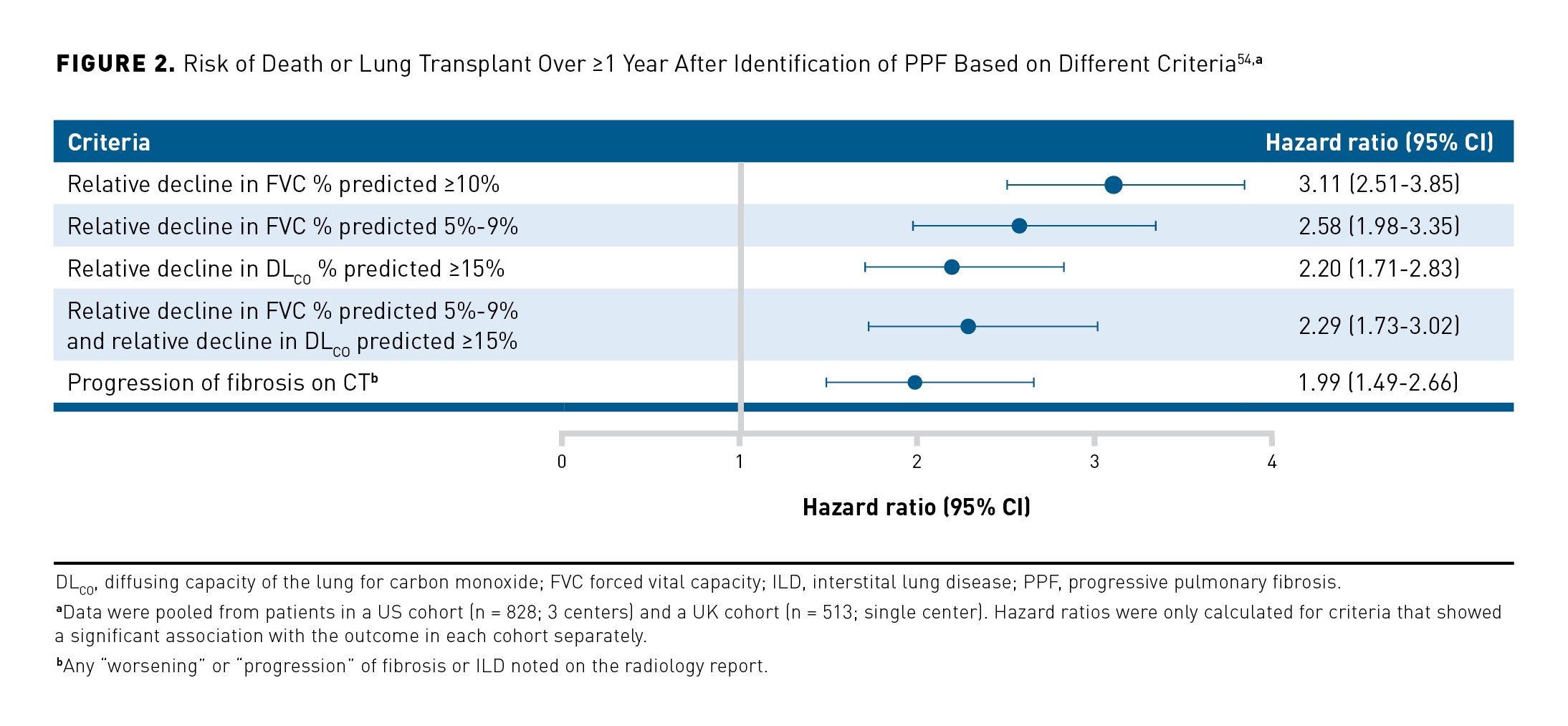 Patients identified as having PPF using different criteria show differences in short-term mortality.22,25,54 In a retrospective analysis of 1341 patients, the risk of death or lung transplant over ≥ 1 year was greater in patients who had PPF defined as a decline in FVC % predicted of > 10% than in patients who met other criteria indicating disease progression (Figure 2).54 However, it is important to bear in mind that regardless of how PPF is identified, it is associated with high rates of hospitalization and death.18,19,22,25,54-56 In a descriptive analysis, over a mean follow-up of 69 months, 46% of 135 patients with PPF had a respiratory hospitalization compared with 22% of 261 patients with fibrosing ILD but without PPF at the same center.55 In the same study, 5-year survival was 64.5% in the patients with PPF compared with 89.5% in the patients without PPF.55 Patients with non-IPF fibrosing ILDs may experience acute lung function deterioration (acute exacerbation), which is associated with high mortality.57-60