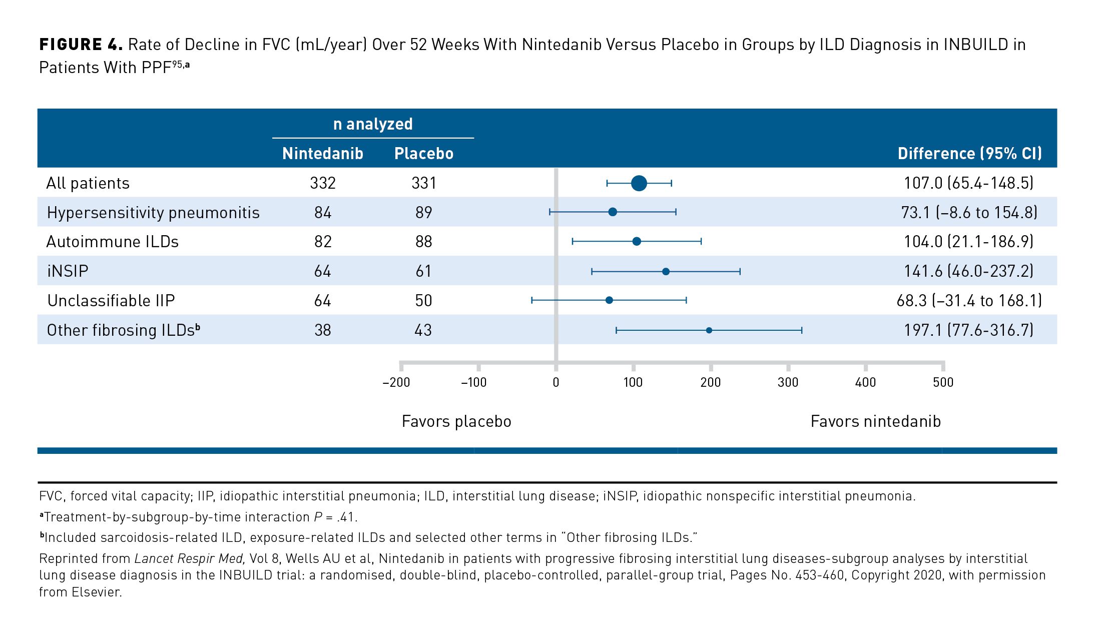 95. Wells AU, Flaherty KR, Brown KK, et al. Nintedanib in patients with progressive fibrosing interstitial lung diseases-subgroup analyses by interstitial lung disease diagnosis in the INBUILD trial: a randomised, double-blind, placebo-controlled, parallel-group trial. Lancet Respir Med. 2020;8(5):453-460. doi:10.1016/S2213-2600(20)30036-9
