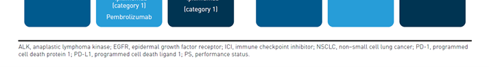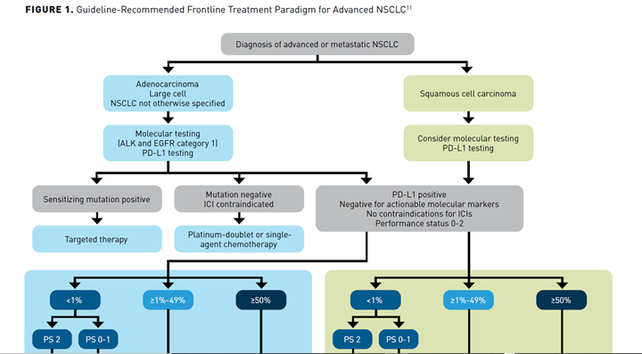 With the growing number of competing FDA-approved ICIs for the frontline management of advanced NSCLC, optimal treatment selection depends increasingly on patient-specific factors. The National Comprehensive Cancer Network (NCCN) has developed evidence-based guidelines to help guide treatment selection (Figure 111). Testing for actionable biomarkers, including PD-L1 expression, is recommended before first-line treatment in patients with metastatic NSCLC, if clinically feasible. Patients with actionable molecular variants in driver oncogenes (eg, epidermal growth factor receptor and anaplastic lymphoma kinase should receive first-line targeted therapy for that oncogene, independent of PD-L1 expression levels. For patients without these targetable alterations, the choice of therapy is guided by PD-L1 expression level and histology.11