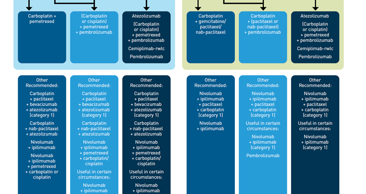 Irrespective of histology and PD-L1 expression level, nivolumab plus ipilimumab in combination with chemotherapy is a category 1 other recommended treatment option, with choice of chemotherapy determined by histology. The dual nivolumab and ipilimumab offers a chemotherapy-sparing alternative regimen, which may be useful in certain circumstances.11