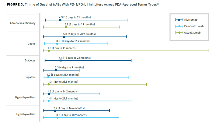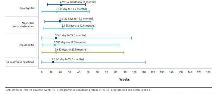 A distinguishing factor of irAEs is their time of onset (typically 3-6 months after treatment initiation) and longer duration compared with targeted therapies (Figure 364). In some cases, irAEs may develop months or even years after ICI treatment discontinuation.33,65 irAEs from CTLA-4 inhibitors tend to present sooner than those from PD-1 or PD-L1 inhibitors, and irAEs from combination therapies present sooner than those from monotherapies.60