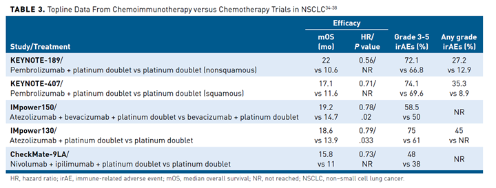 In the phase 3 EMPOWER-Lung 3 trial, the combination of cemiplimab and platinum-based chemotherapy was evaluated as first-line treatment of advanced/metastatic NSCLC. The trial was halted early due to a statistically significant improvement in OS in the combination arm at the interim analysis (mOS: 22 months vs 13 months; HR, 0.71; P = .014). No new safety signals were reported.46