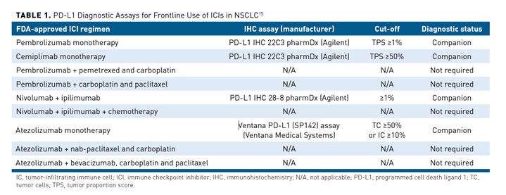 PD-L1 testing via immunohistochemical analysis has become an important tool for clinical decision making in patients with advanced or metastatic NSCLC. Several assays have been developed that differ in the specific antibodies used to detect PD-L1 expression, the detection systems employed, and the thresholds for PD-L1 positivity (Table 115). Different ICIs were approved together with different companion diagnostics; pembrolizumab and cemiplimab were approved in conjunction with the PD-L1 IHC 22C3 pharmDx assay, while the Ventana PD-L1 (SP142) assay is approved to identify patients eligible for atezolizumab treatment.16-18 The 22C3 assay measures the tumor proportion score (TPS), which is defined as the total number of tumor cells demonstrating partial or complete membrane staining of any intensity. The SP142 assay reports a tumor cell and immune cell score, measuring the number of tumor cells that stain positive for PD-L1 as a proportion of the total number of tumor cells and the percentage of the total tumoral area occupied by positive immune cells, respectively.19