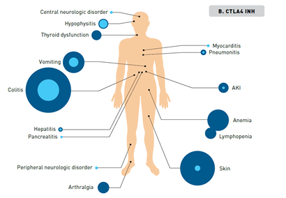 Immune checkpoint blockade results in activation of T cells against tumor cells, which underlies their antitumor efficacy but can also result in unique irAEs. irAEs can impact virtually any organ, with varying frequency and severity across patients and according to the specific ICI (Figure 257). CTLA-4 inhibitors are associated with more frequent and severe irAEs than PD-1 and PD-L1 inhibitors, while PD-1 inhibitors tend to elicit a higher rate of irAEs compared with PD-L1 inhibitors. A patient’s overall health, the presence of comorbidities, or receipt of prior ICI therapy can impact the risk of irAEs.58-60