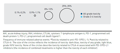 The greater efficacy of combination therapy comes at the expense of increased toxicity. In particular, dual ICI combinations can lead to more frequent or severe irAEs. The combination of ICIs with chemotherapy or targeted therapies typically has less impact on the frequency and severity of irAEs because the toxicity profiles of the drugs are largely non-overlapping. However, these combinations can present a challenge in distinguishing irAEs from toxicities caused by the partner drug, which can have distinct underlying causes that may necessitate different management strategies.59,60