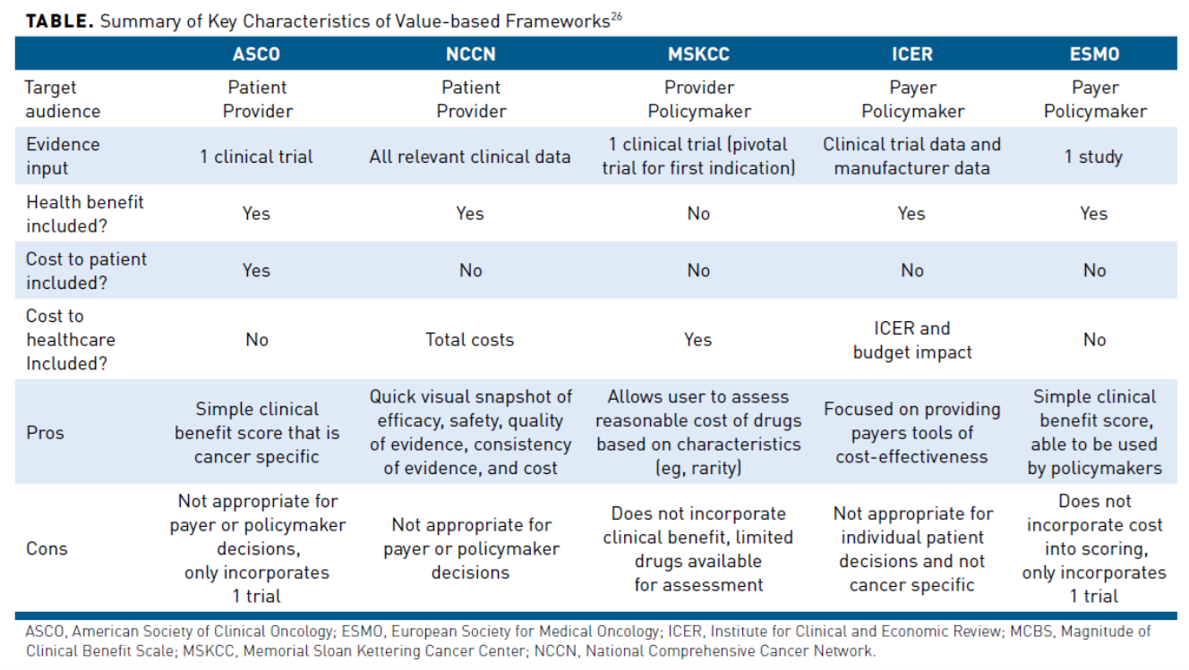 26. Slomiany M, Madhavan P, Kuehn M, Richardson S. Value frameworks in oncology: comparative analysis and implications to the pharmaceutical industry. Am Health Drug Benefits. 2017;10(5):253-260.