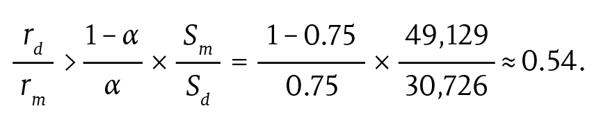 After running the bootstrap and understanding the spending and variation left in the sample after risk adjustment, we can assess the conditions under which a provider group will prefer including drugs in the model. Once again, we use group A as an example. For group A, α is approximately equal to 0.75. We can use α to obtain a threshold rule for including drugs in the APM that compares the savings rates on drug and nondrug spending with estimates from our data: