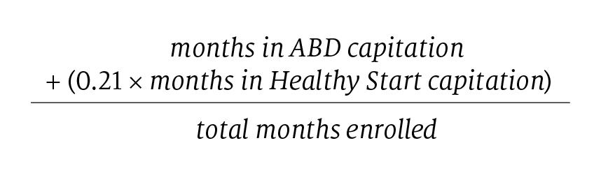 We used a capitation adjustment of 0.21 to approximate PFK’s 4.79-fold differential between the capitation rates during the study period. Using this formula, a child covered for a full year as ABD would have an ECR of 1.0, meaning that PFK would receive 100% of the potential ABD capitation rate for that child. Alternatively, if that child experienced a 2-month switch to Healthy Start eligibility, the ECR would be 0.868 ([10 + (0.21 × 2)] / 12) and PFK would realize only 86.8% of the potential ABD capitation rate.