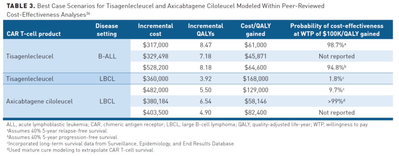 In patients with B-cell lymphoma, the cost-effectiveness of axicabtagene ciloleucel compared with chemotherapy was modeled in 2 different studies. Again, the costs for CAR T-cell therapy were higher, but so were QALYs gained. Cost-effectiveness estimates ranged from $58,000 to $289,000/QALY. In a separate study, tisagenlecleucel was shown to have similar cost-effectiveness to axicabtagene ciloleucel in the setting of B-cell lymphoma. A conservative estimate of cost-effectiveness was $223,000/QALY and an optimistic estimate was $168,000/QALY for tisagenlecleucel in this cancer type.38,39
