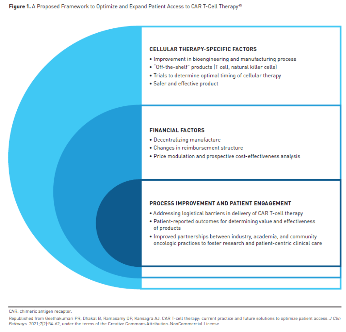 45. Geethakumari PR, Dhakal B, Ramasamy DP, Kansagra AJ. CAR T-cell therapy: current practice and future solutions to optimize patient access. J Clin Pathways. 2021;7(2):54-62. doi: 10.25270/jcp.2021.03.00002
