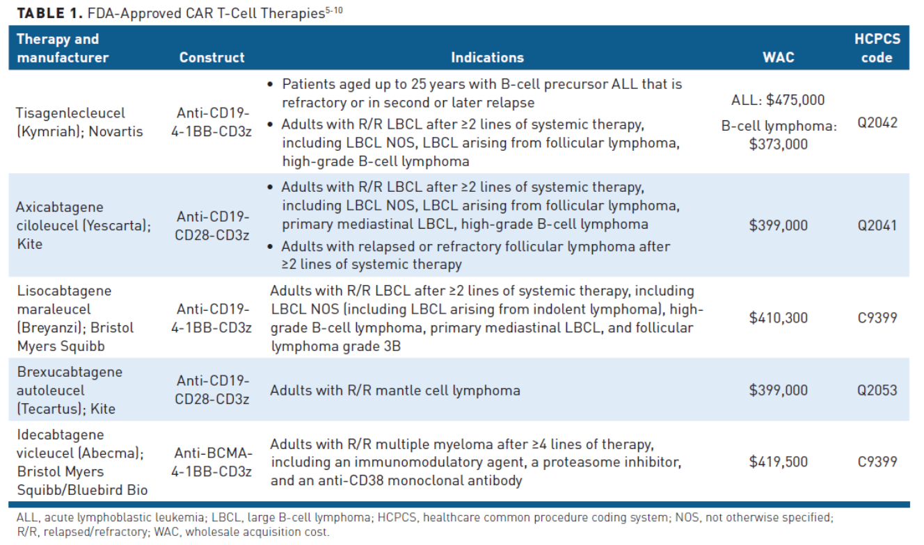 30. Hagen T. CAR T-cell therapy: the sticker price is just for openers. OncologyLive. 2018;19:12. Accessed May 24, 2021. www.onclive.com/view/car-tcell-therapy-the-sticker-price-is-just-for-openers